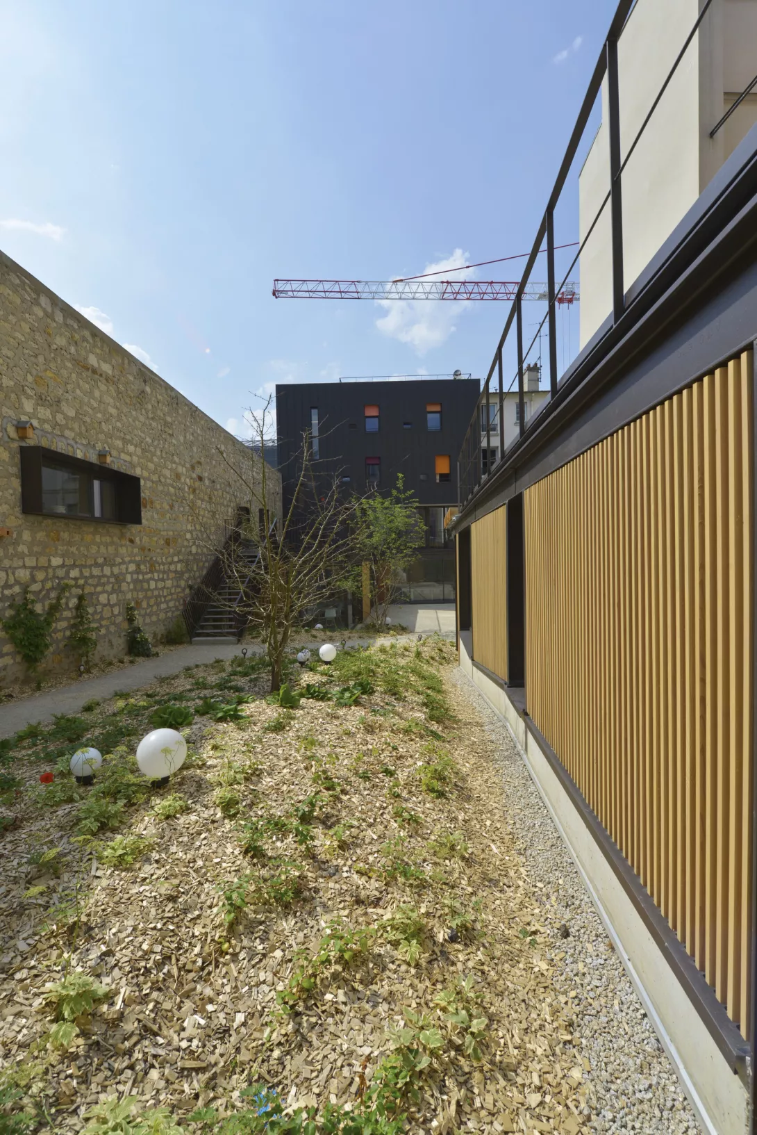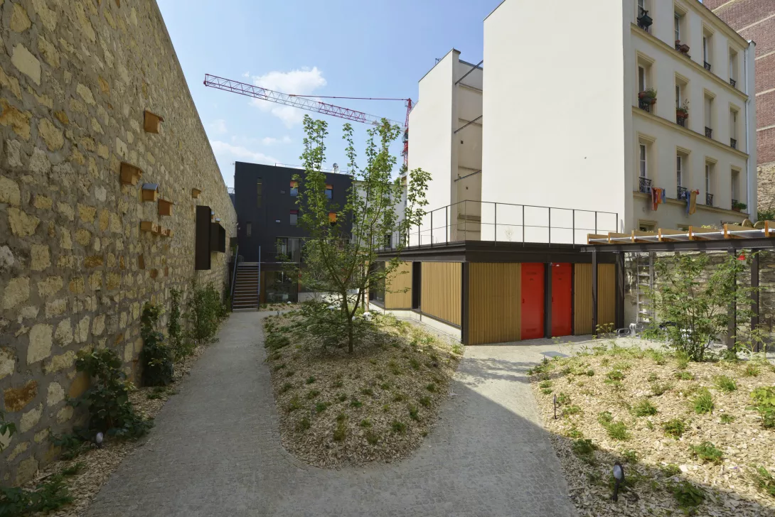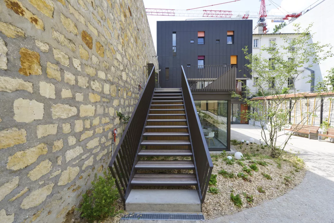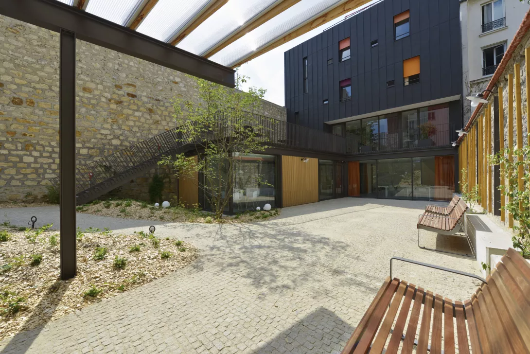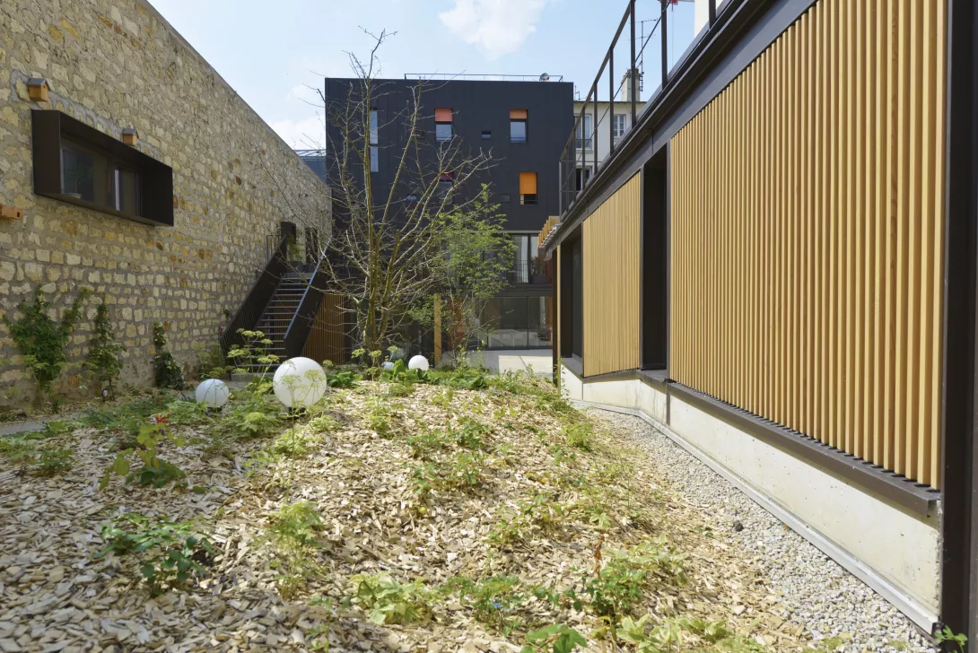Réhabilitation et doublement de surface en extension du bâtiment. Les planchers du Bâtiment existant sont démolis et reconstruits. Le bâtiment jardin est réalisé en structure métallique avec toiture type plancher bac collaborant, isolé, étanché et végétalisé