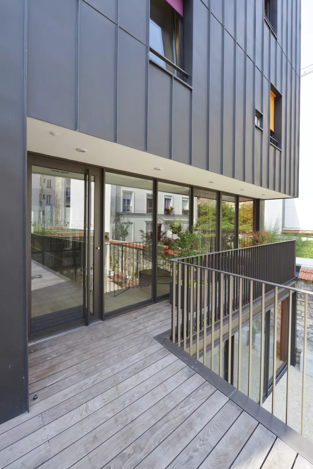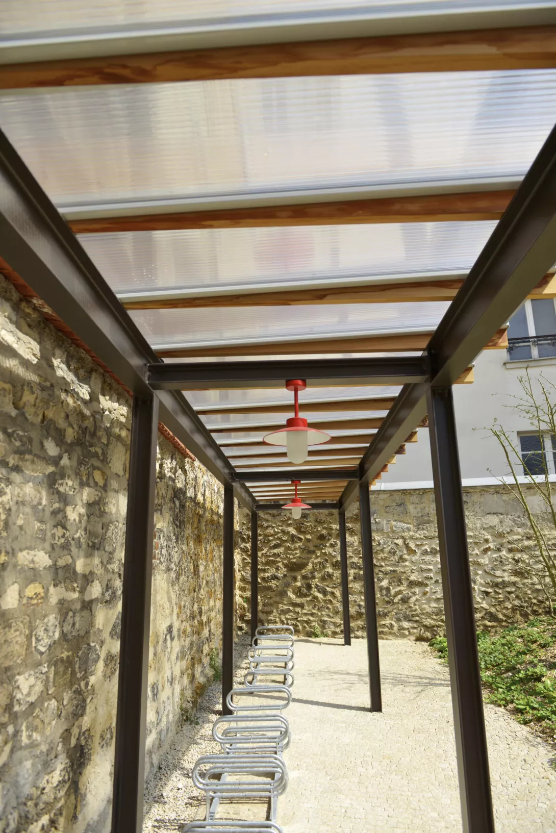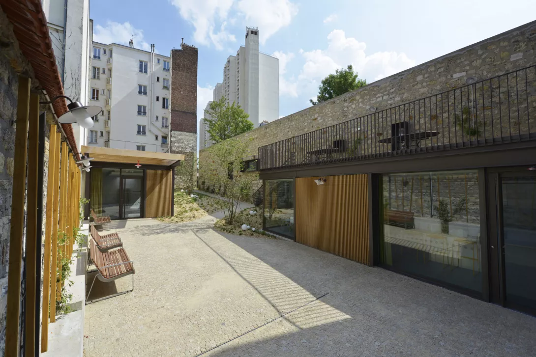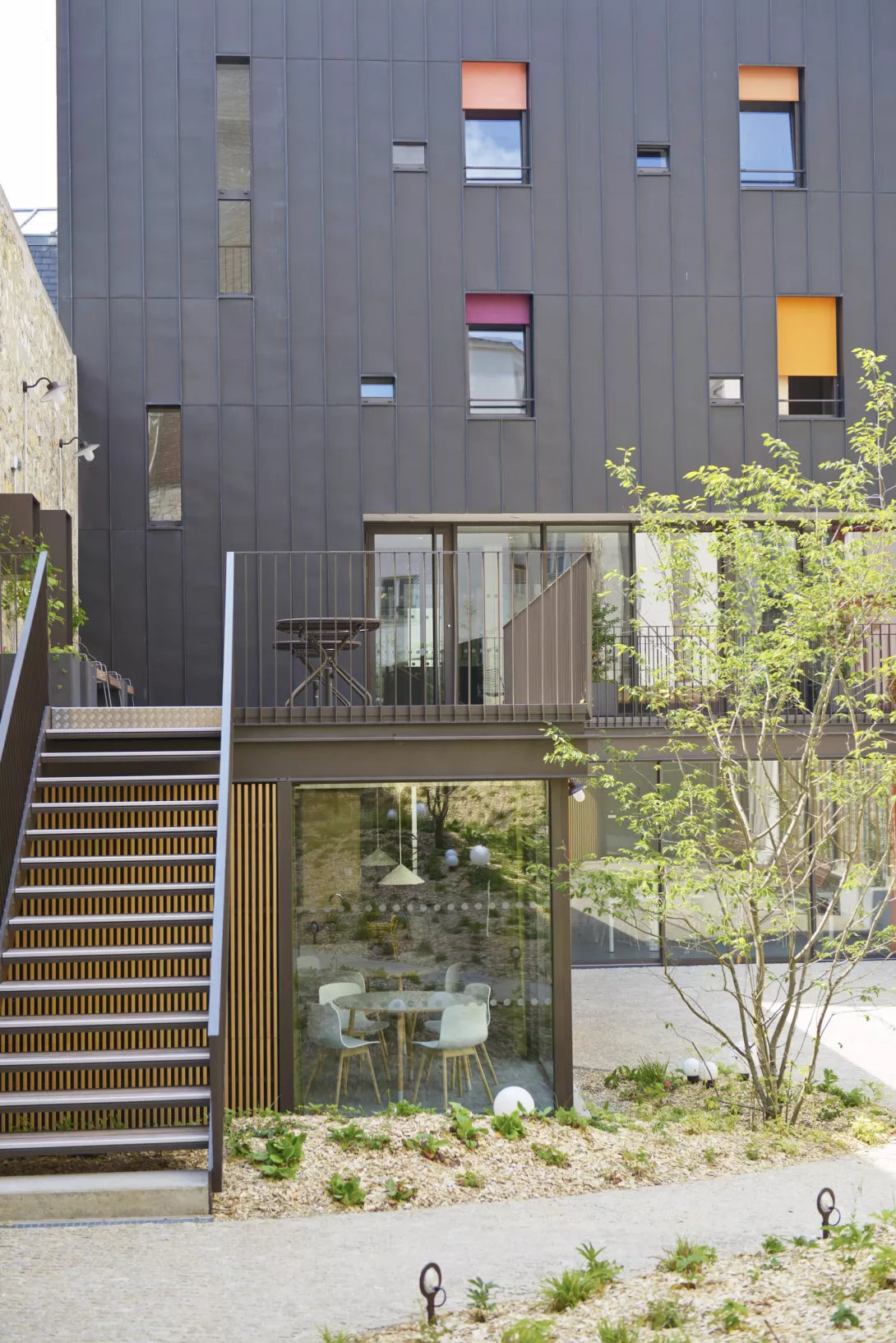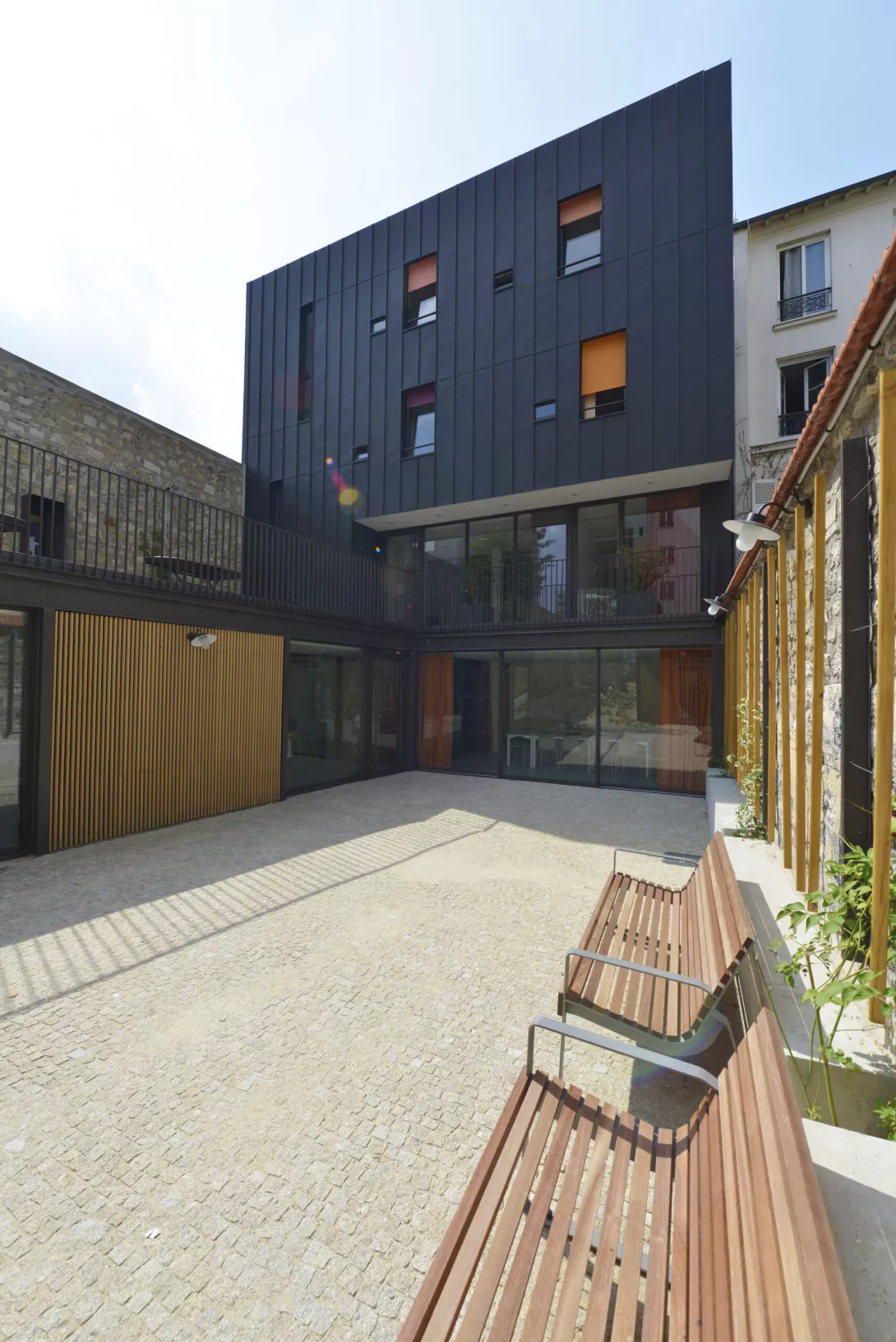 Réhabilitation et doublement de surface en extension du bâtiment. Les planchers du Bâtiment existant sont démolis et reconstruits. Le bâtiment jardin est réalisé en structure métallique avec toiture type plancher bac collaborant, isolé, étanché et végétalisé