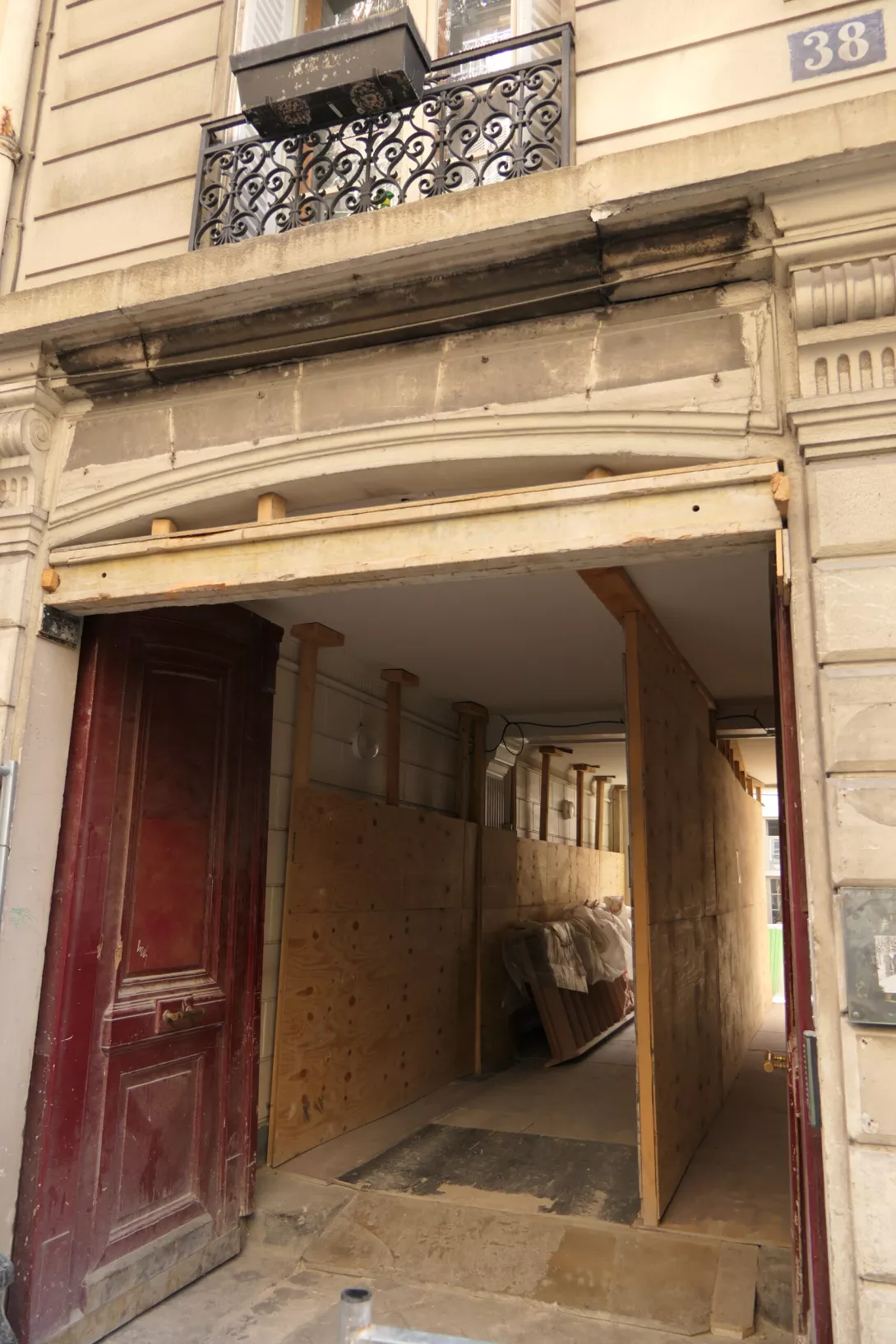Restructuration et extension en maçonnerie. Accès à travers un porche au chantier. Réhabilitation de deux bâtiments pour l’aménagement de la crèche