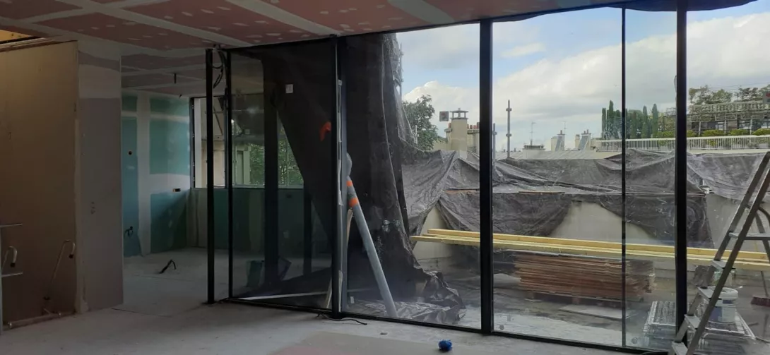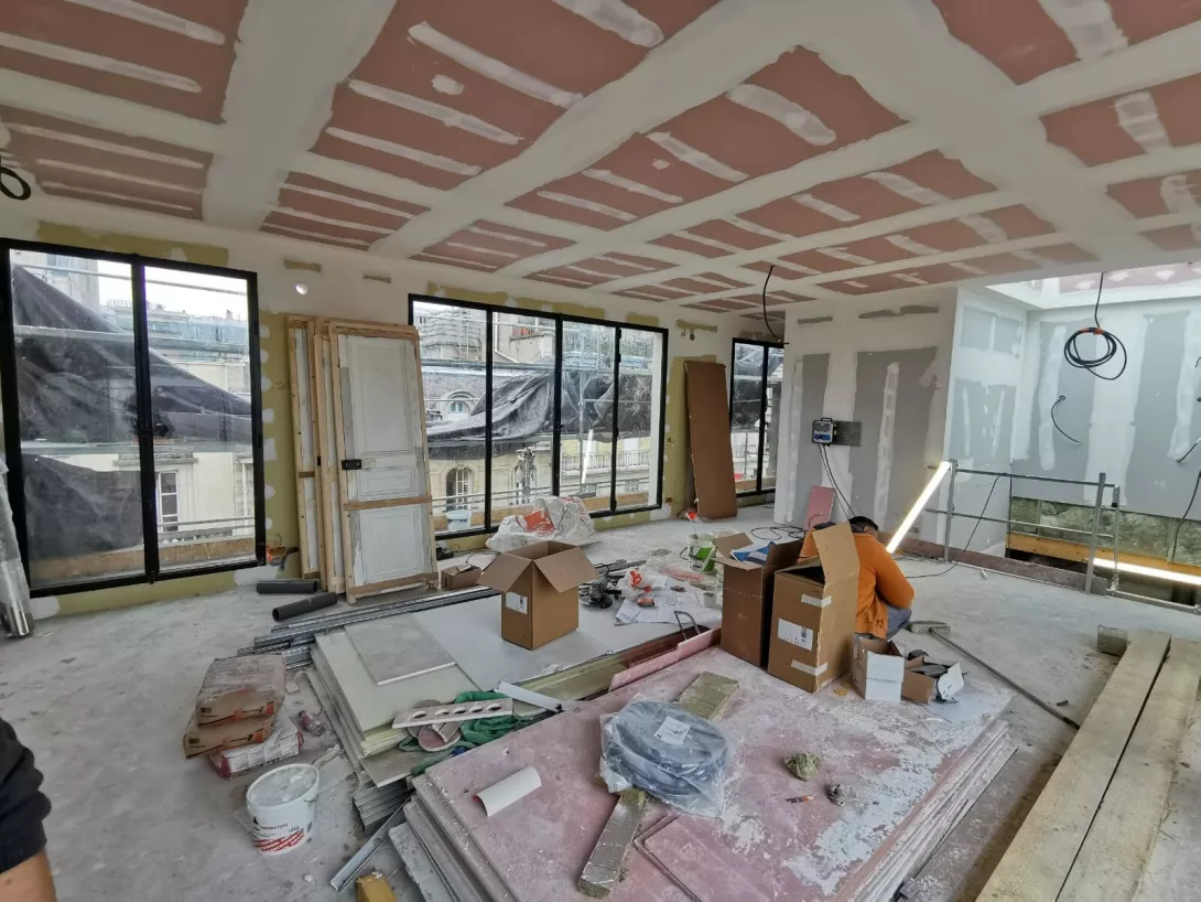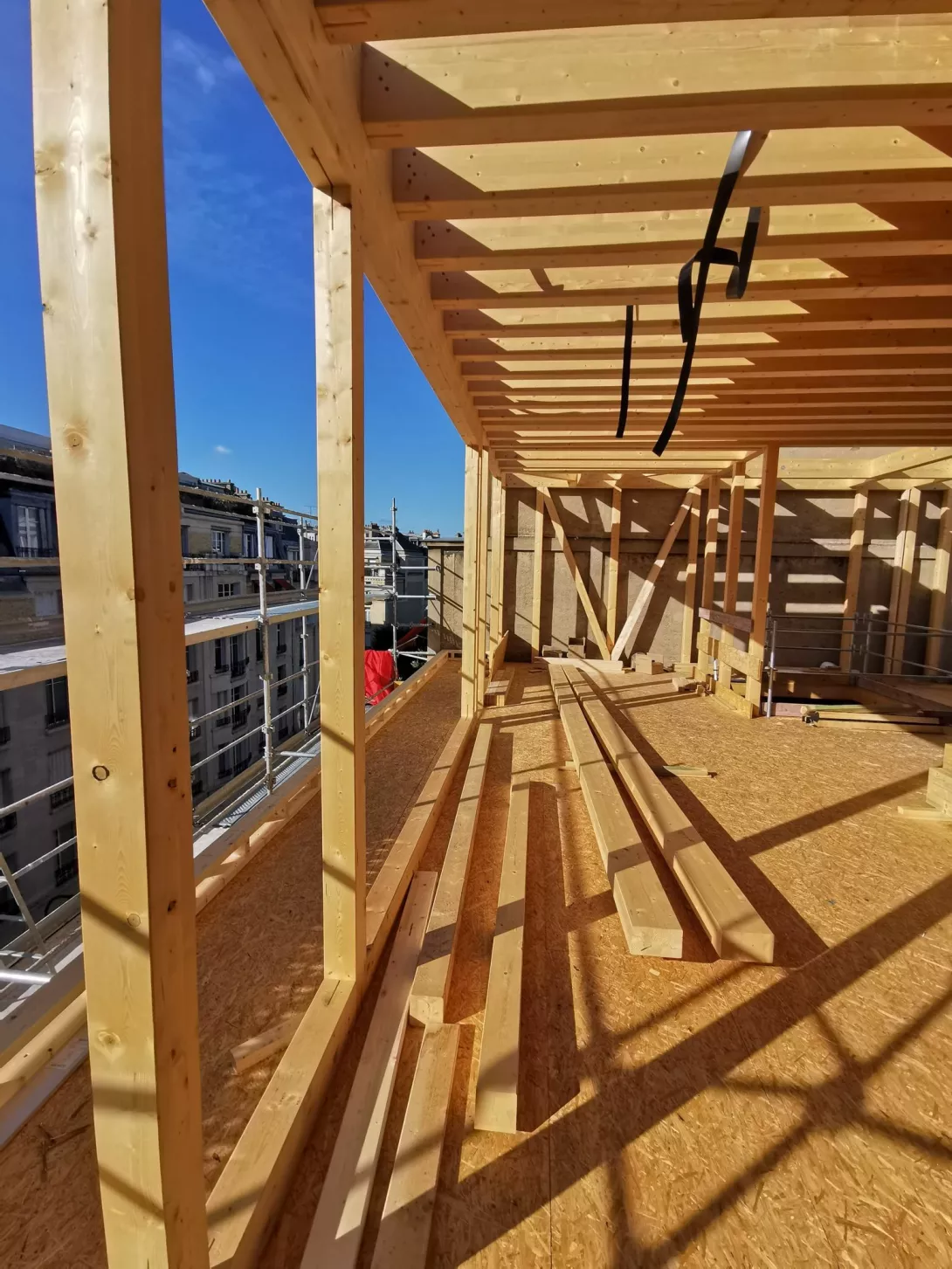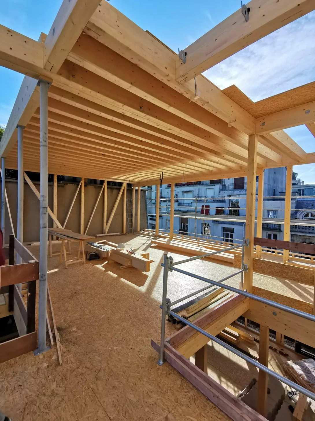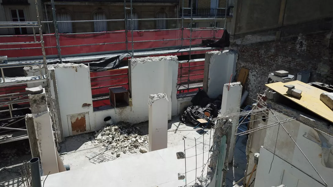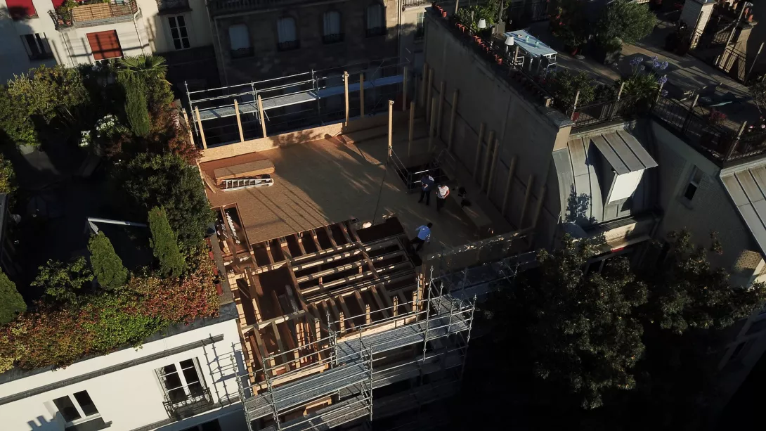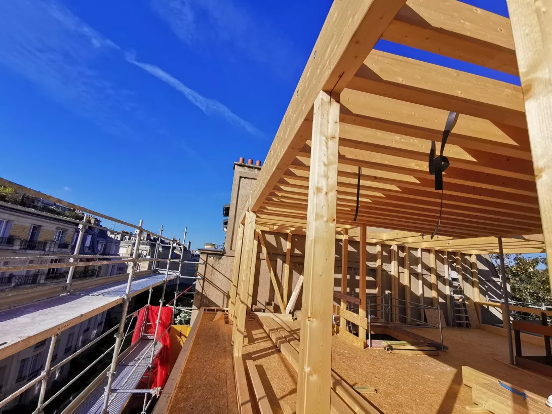 Surélévation de 2 niveaux supplémentaires, après dépose de la toiture actuelle, et création d’une surface de 110,5 m2 au R+4 et de 82,3m2 au r+5, permettant l’aménagement d’un appartement en duplex sur ces deux ni¬veaux ; Le prolongement de l’ascenseur existant, et sa mise aux normes pour per¬mettre l’accès au R+4, niveau d’accès du duplex R+4-R+5 ; Le prolongement de l’escalier commun jusqu’au niveau R+4, et la réalisation d’un conduit et d’une trappe de désenfumage (1 m2) des parties communes, située en surélévation au niveau de la terrasse du R+5 ;L’adaptation du palier de l’escalier commun au niveau R+3, pour permettre son prolongement jusqu’au niveau R+4 ; La réalisation d’un petit balcon ouvert au niveau R+4 côté cour ; La réalisation d’une terrasse privative (32,7 m2) au niveau R+5 du duplex. La reprise (ravalement) de la façade côté rue par la mise en place d’un enduit pelliculaire aspect pierre (type ammonite ou similaire), qui reprend le calepi¬nage actuel des pierres de la façade et est en similitude avec les façades des deux immeubles voisins. (conforme aux prescriptions du service du paysage de la rue de la Mairie de Paris)